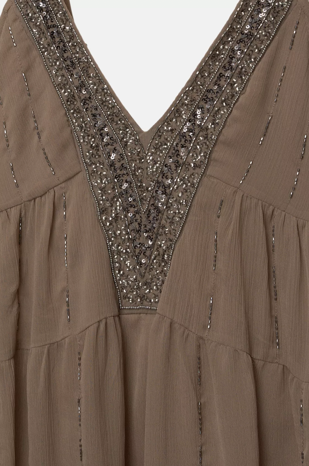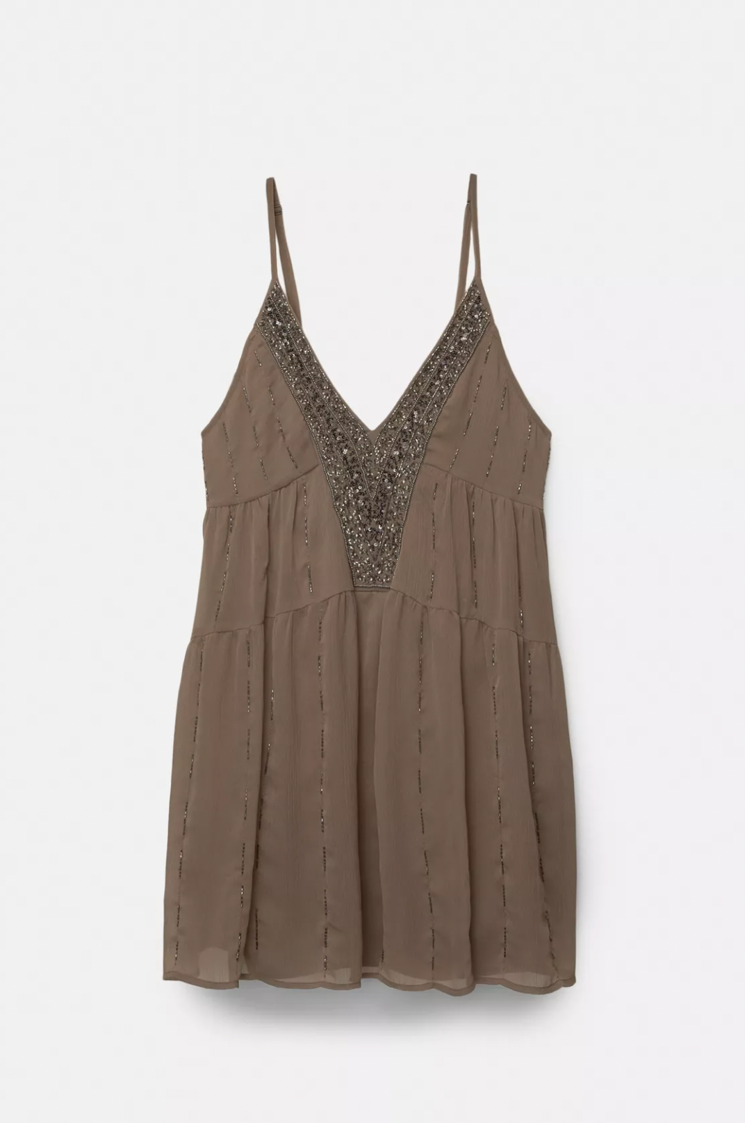 Channel effortless summer energy with this flowy beaded mini dress. Designed in a relaxed silhouette with a flattering deep V-neckline, it features delicate bead detailing that catches the light in all the right ways. Lightweight, breezy, and easy to dress up or down. It’s your go-to piece for beach days, brunch dates, or dancing under the stars.